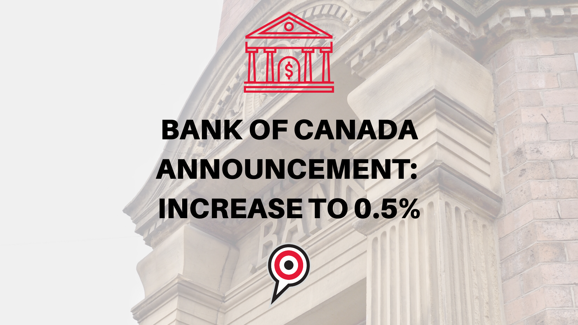 The Bank of Canada raises key interest rate by 0.25 per cent to a new overnight rate of 0.5 per cent