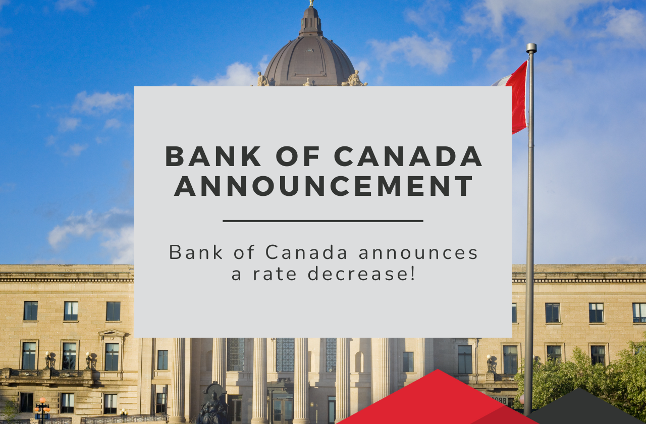 The Bank of Canada announced that it will decrease the overnight rate by .25%, to a new overnight rate of 4.75%.